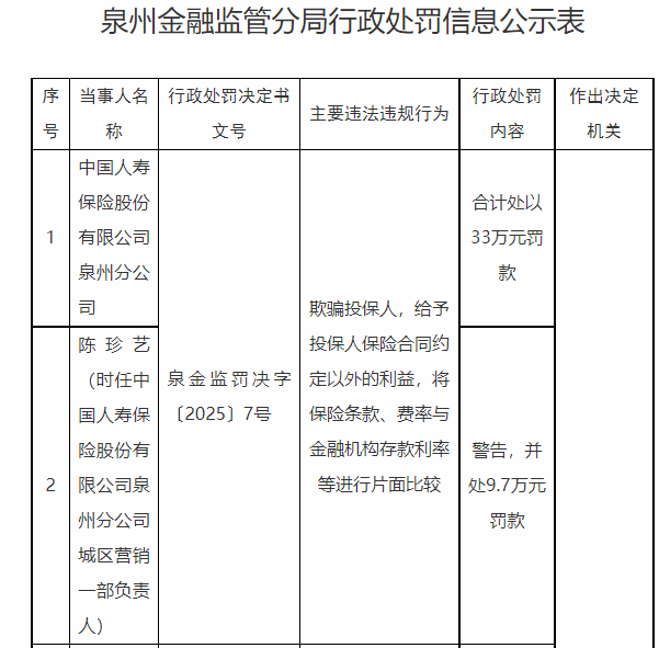 中国经济网北京11月26日电 昨天国家金融监管局网站公布的泉州市金融监管局行政处罚信息公示表(泉金监行决字[2025]7号)显示,国寿控股有限公司泉州分公司欺骗投保人,向投保人提供保险合同约定以外的利益。该公司因单方面将保险条件、保费率与金融机构存款利率进行比对,被泉州市金融监管局罚款共计33万元。陈振义(时任中国人寿控股有限公司泉州分公司城市营销部经理)受到警告,并处罚款9.7万元。行政处罚泉州市金融监管局昨日发布的《泉州市金融监管局信息公开表》(泉金监税字[2025]8号)显示,华寿控股有限公司安溪县分公司营业服务二部财务数据虚假,泉州市金融监管局对其处以10万元罚款。郑志龙(时任中国人寿控股有限公司安溪县分公司营业二部总经理)受到警告,并处罚款11000元。泉金监防决字[2025]9号因证明华寿控股股份有限公司南安分公司财务数据虚假,被泉州市金融监管局罚款18万元。他先生戴培坤(时任中国人寿保险股份有限公司南岸分公司银行保险总监)受到警告,并罚款3万元。泉金建丰爵字[2025]10号被泉州市金融监管局罚款11万元g 认为中国人寿控股有限公司永春县分公司财务数据不实。郑世龙(时任中国寿博永春县分公司经理)受到警告并罚款13000元。据“全金监房决字”[2025]11号文显示,国寿控股有限公司泉州泉港区分公司因向投保人提供非合同约定利益,被泉州市金融监管局罚款14万元。潘金变先生(时任中国人寿控股有限公司泉州泉港区分公司副主任)受到警告,并处罚款4.5万元。全金检风决字[2025]12号中文店营销服务二部被证实财务数据虚假,被泉州市金融监管局罚款12万元。时任中国人寿保险股份有限公司南岸分公司营销拓展部经理刘建峰受到警告处分d 罚款16000元。